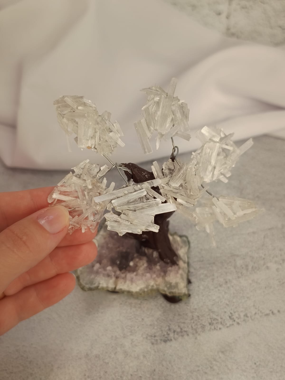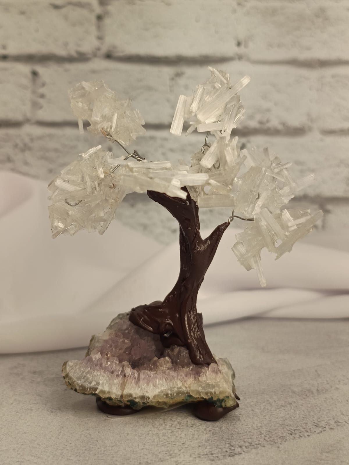 Base de ametista, caule de cola plástica, galhos de metal e folhas de cascalho de selenita.