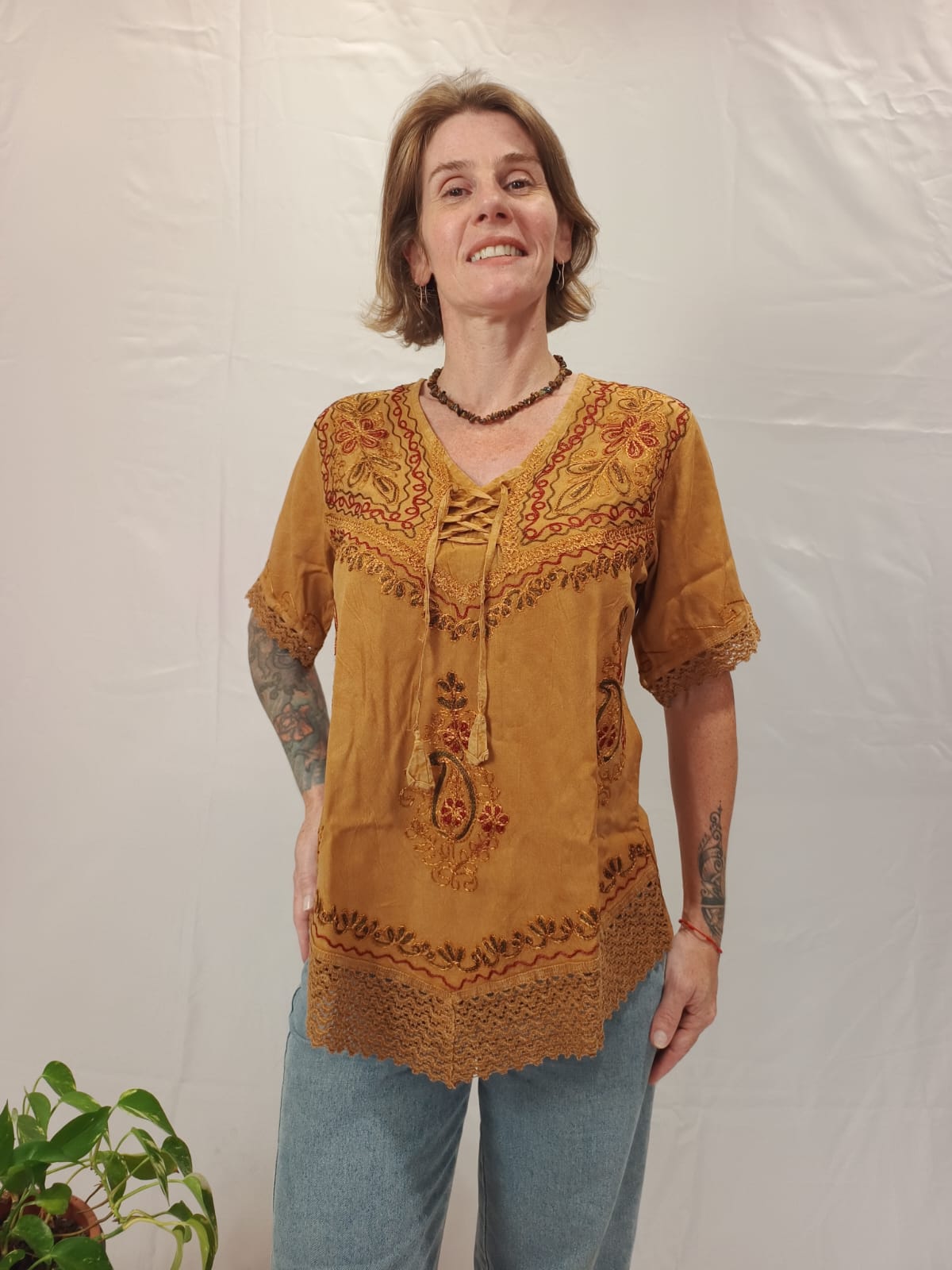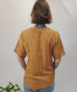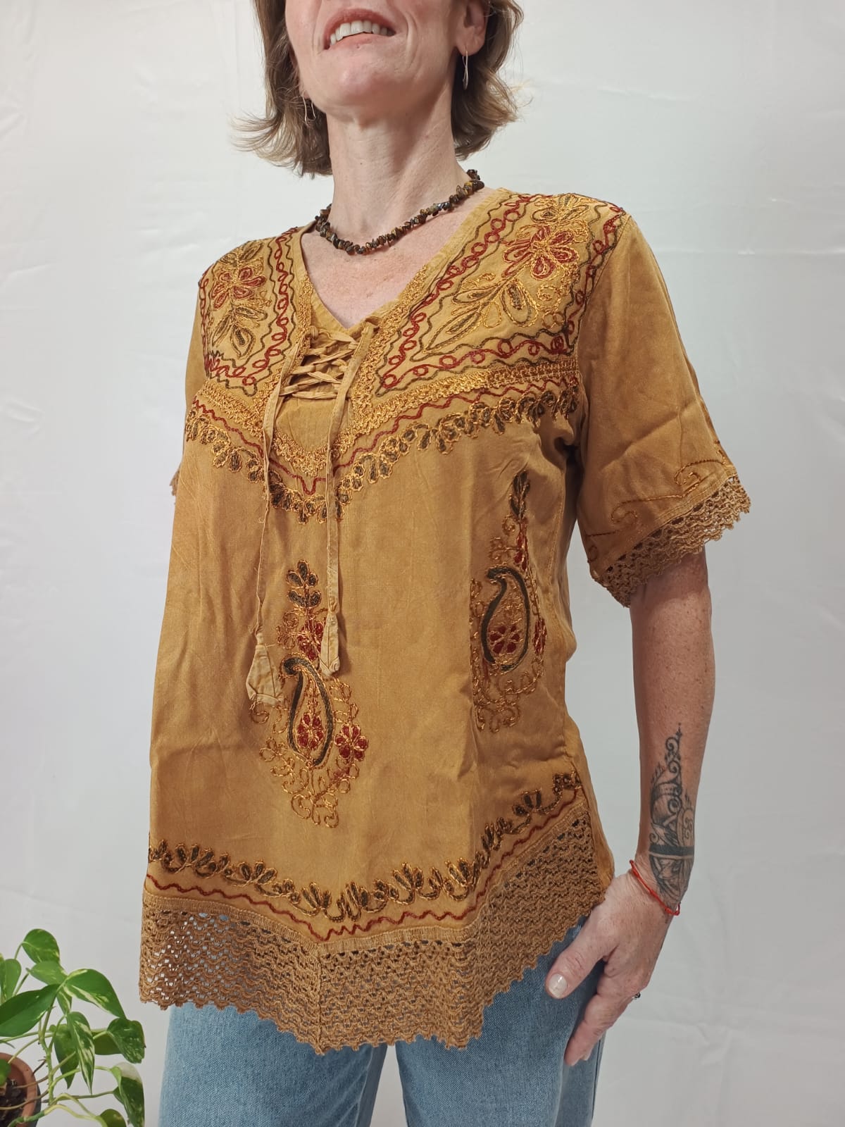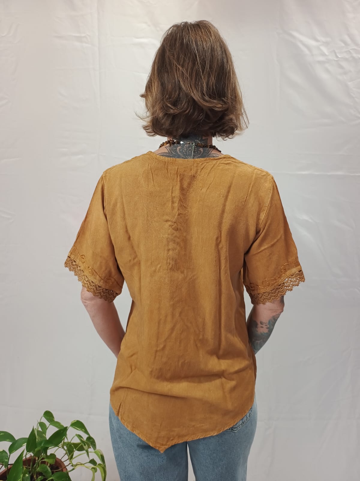 No tamanho M: comprimento do ombro até a ponta central 70 cm. Busto 96 cm de circunferência e manga 36 cm de circunferência.