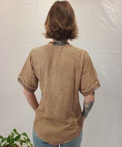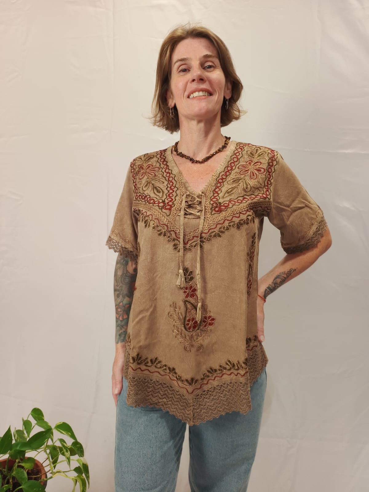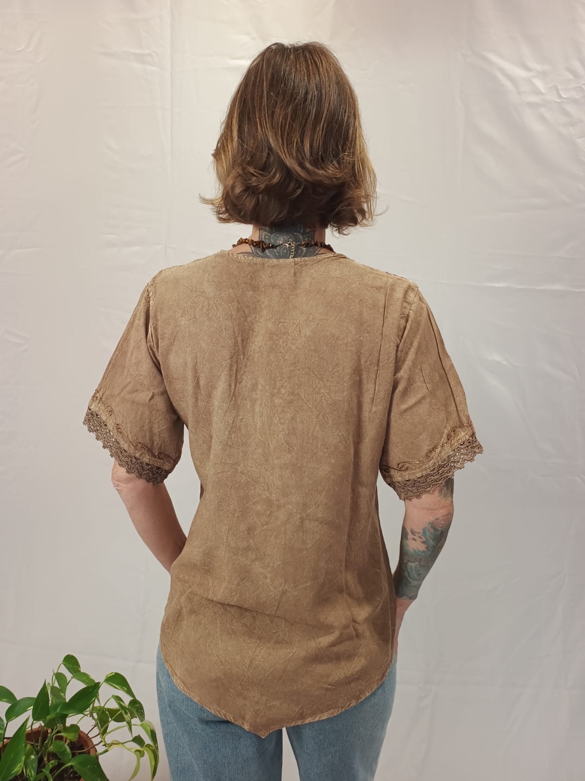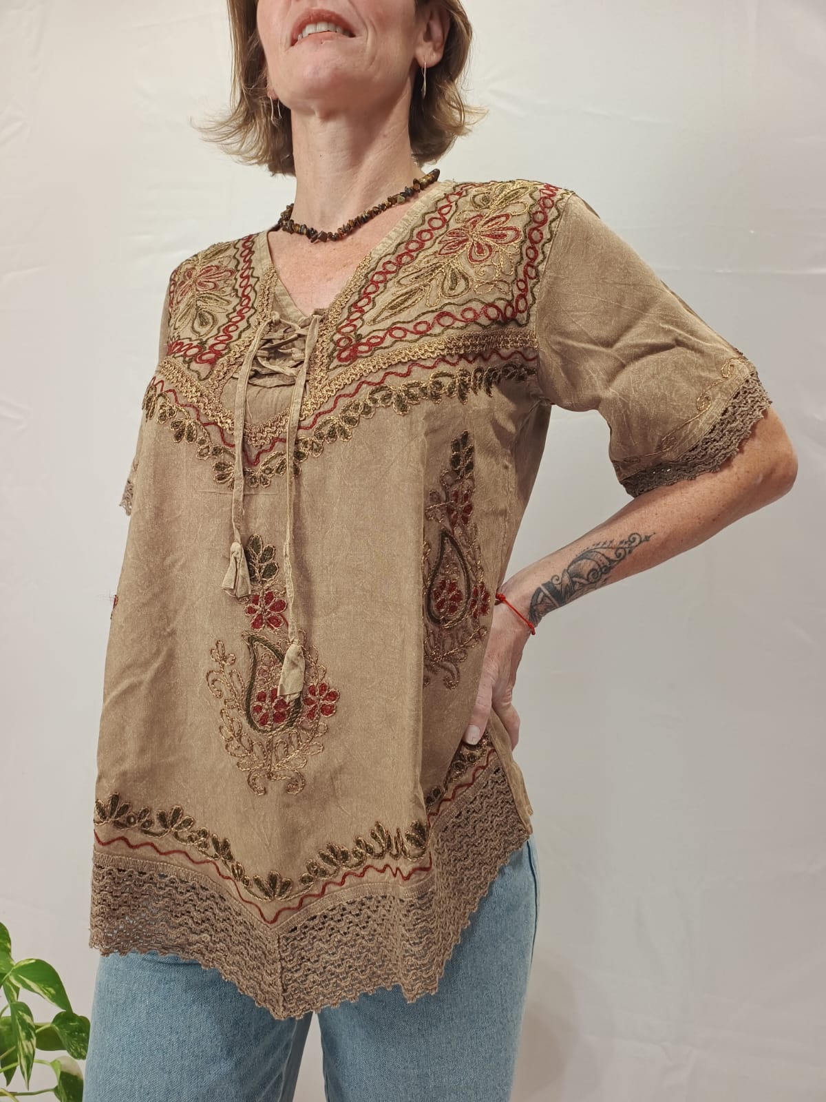 No tamanho M: comprimento do ombro até a ponta central 70 cm. Busto 96 cm de circunferência e manga 36 cm de circunferência.