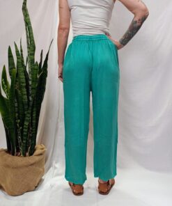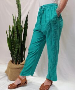 120 cm de comprimento, 136 cm de cintura (com elástico e cordão para ajuste) e 140 cm de quadril.