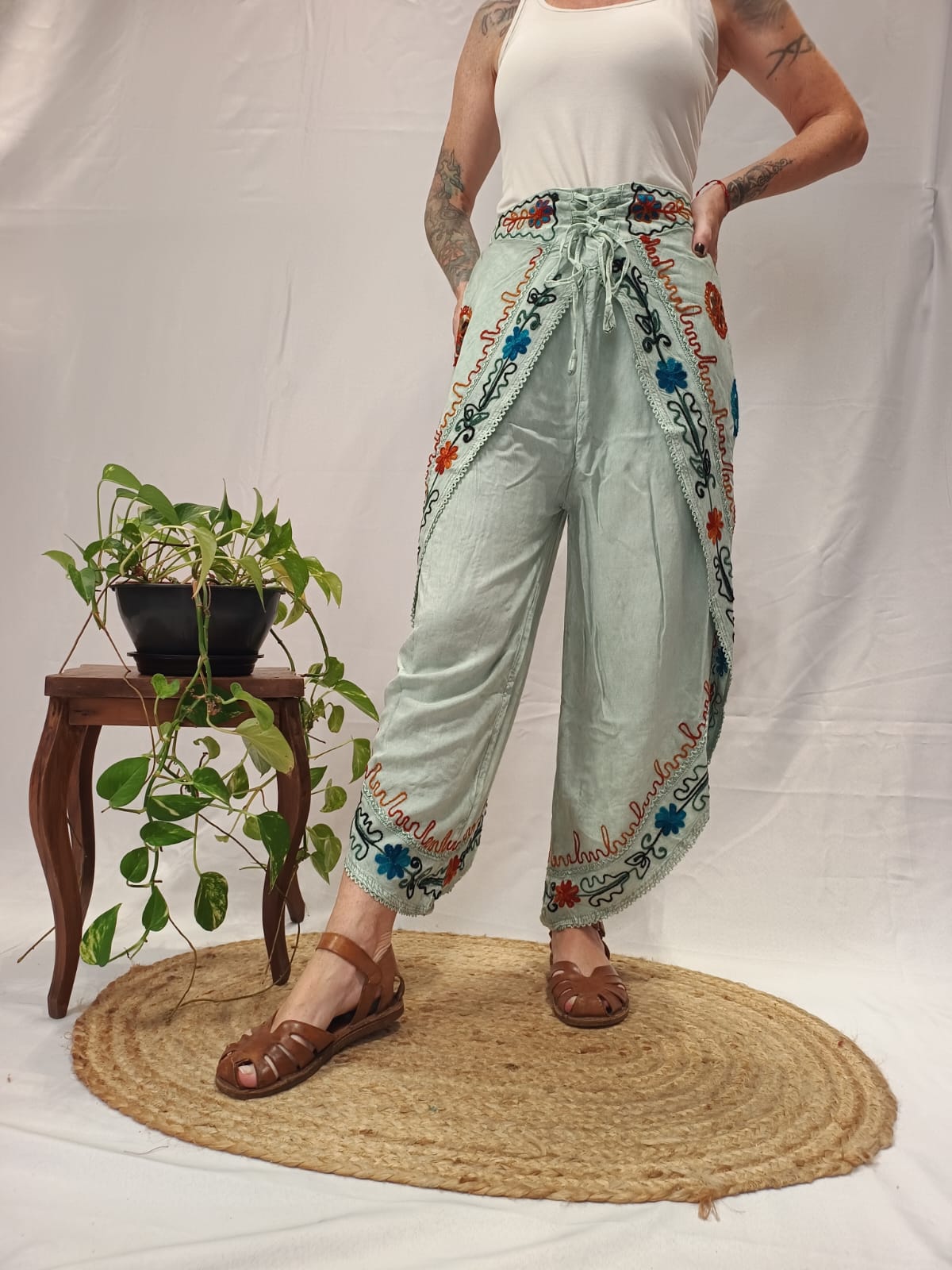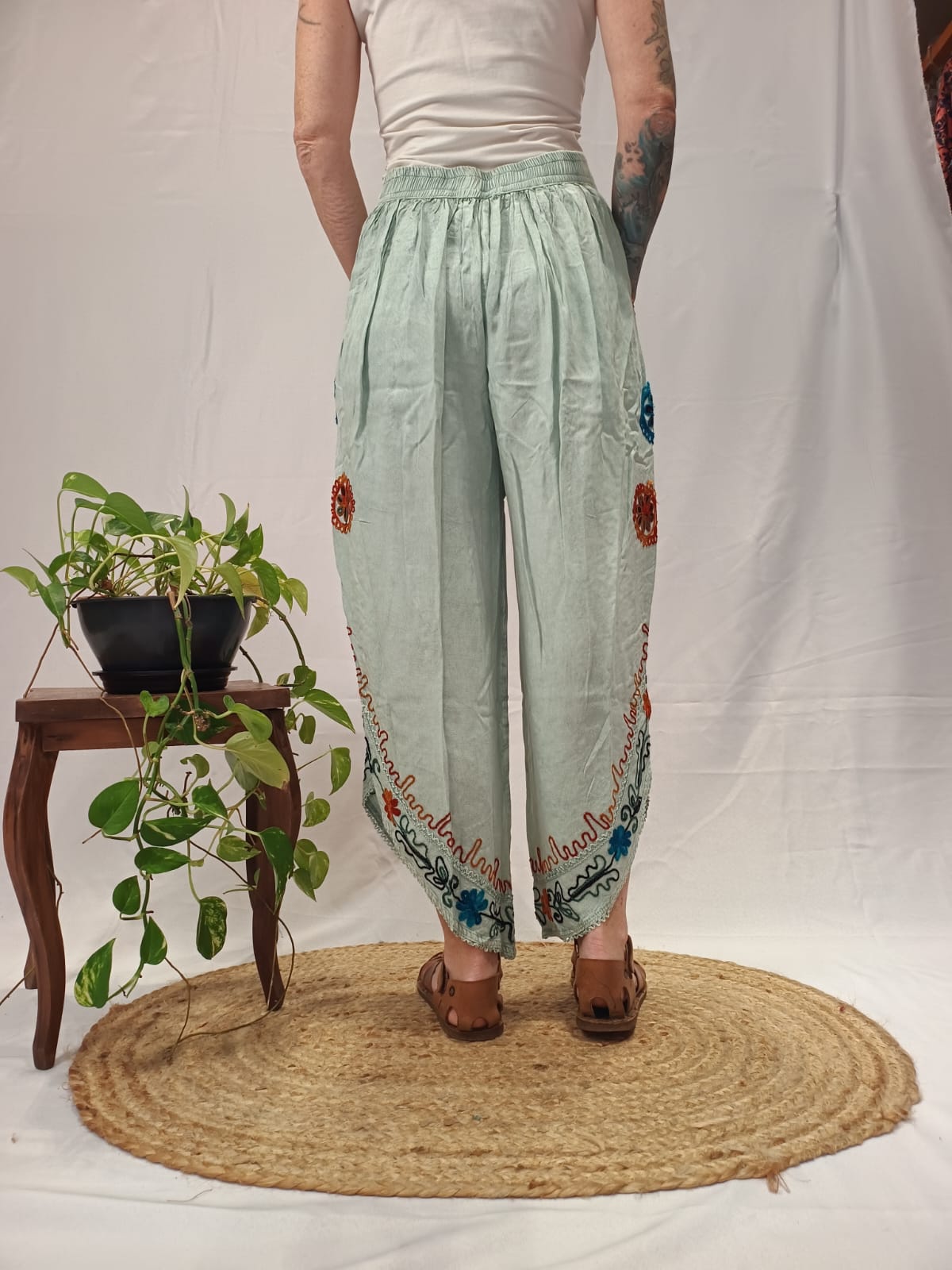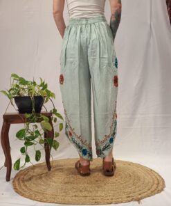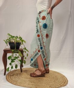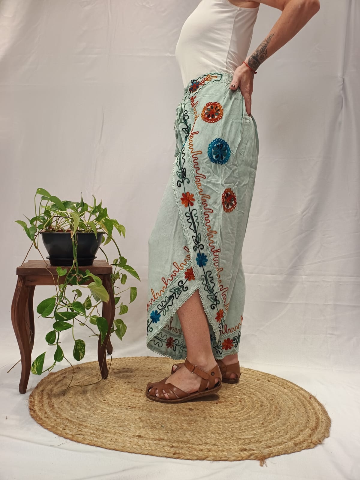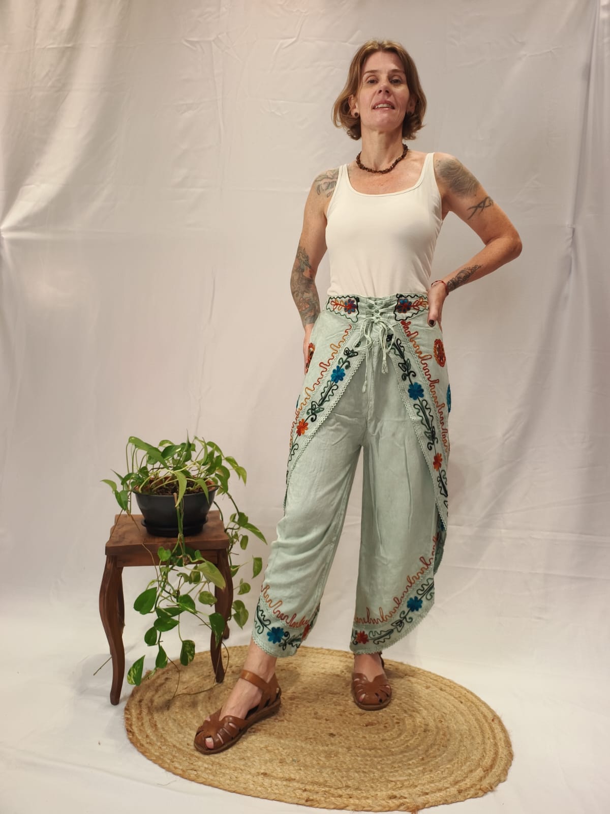 100% viscose, bordados em ponto baixíssimo.
