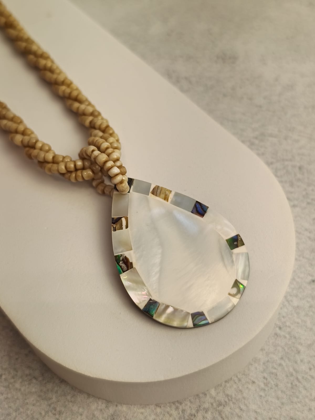 Nylon, miçanga, abalone e madrepérola.