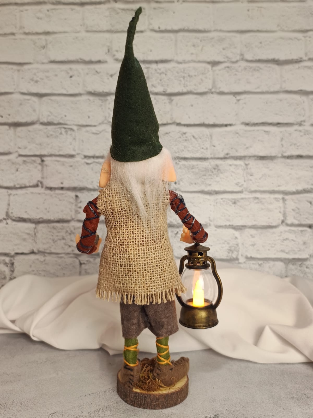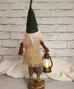 Base madeira, corpo de biscuit e roupa de feltro. Lampião já vem com pilha.