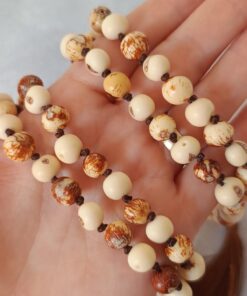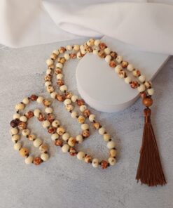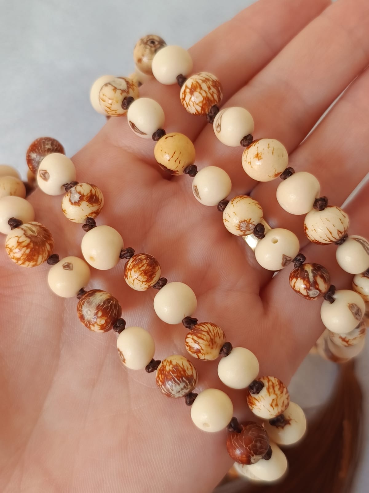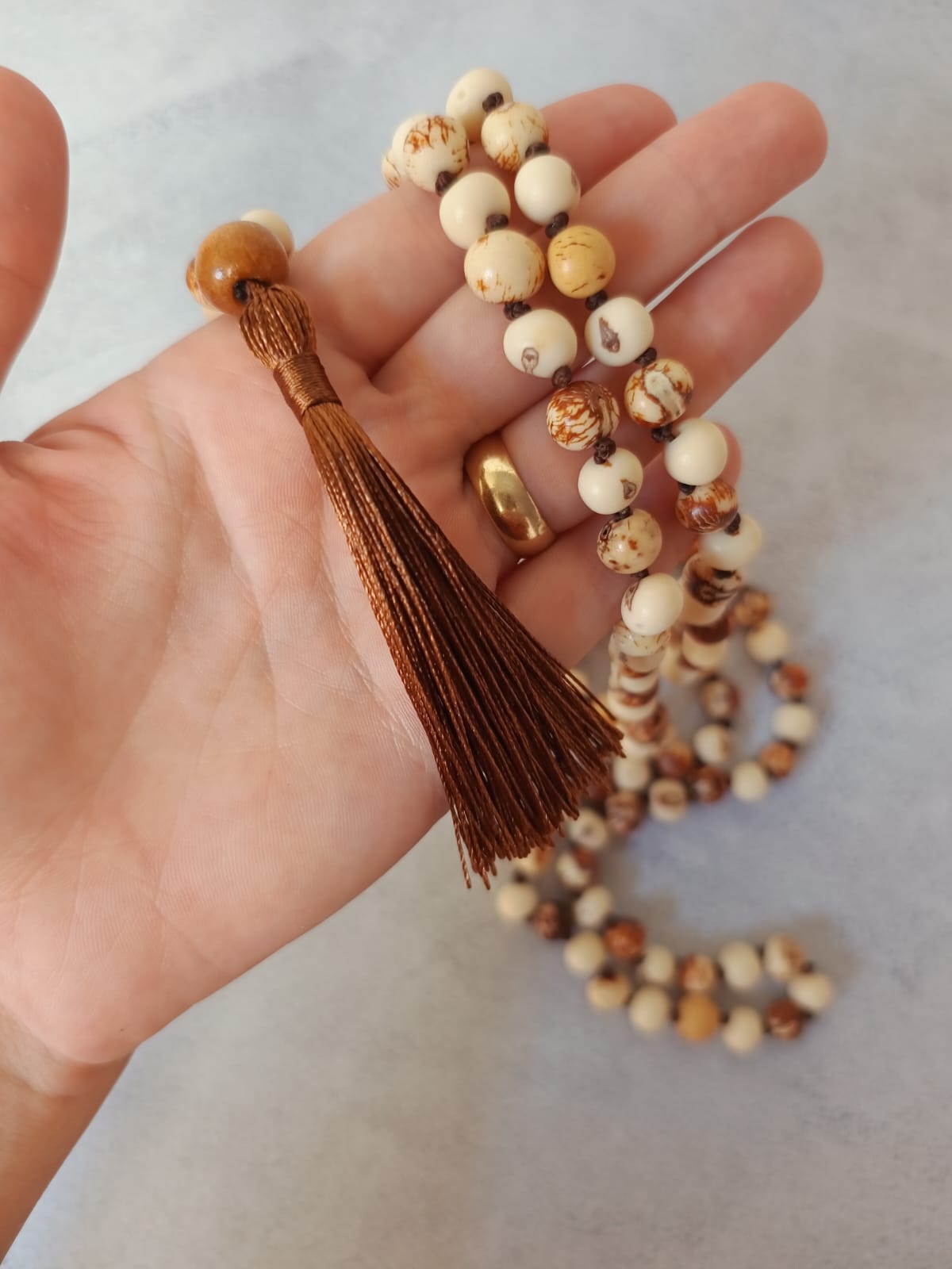 O Japamala de 108 Contas é um cordão usado na prática espiritual do hinduísmo e budismo. Cada conta representa uma repetição de um mantra durante a meditação, enquanto os praticantes deslizam uma conta entre os dedos. Com um nó guru marcando o início e o fim, e um nó entre cada conta, facilita a contagem e promove uma meditação concentrada. Feitos à mão por nós, com sementes de açaí.