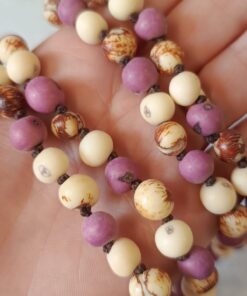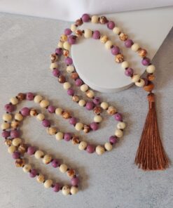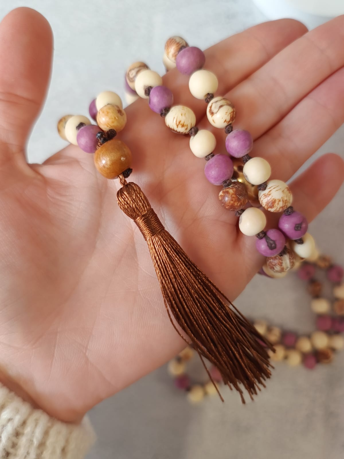 O Japamala de 108 Contas é um cordão usado na prática espiritual do hinduísmo e budismo. Cada conta representa uma repetição de um mantra durante a meditação, enquanto os praticantes deslizam uma conta entre os dedos. Com um nó guru marcando o início e o fim, e um nó entre cada conta, facilita a contagem e promove uma meditação concentrada. Feitos à mão por nós, com sementes de açaí.