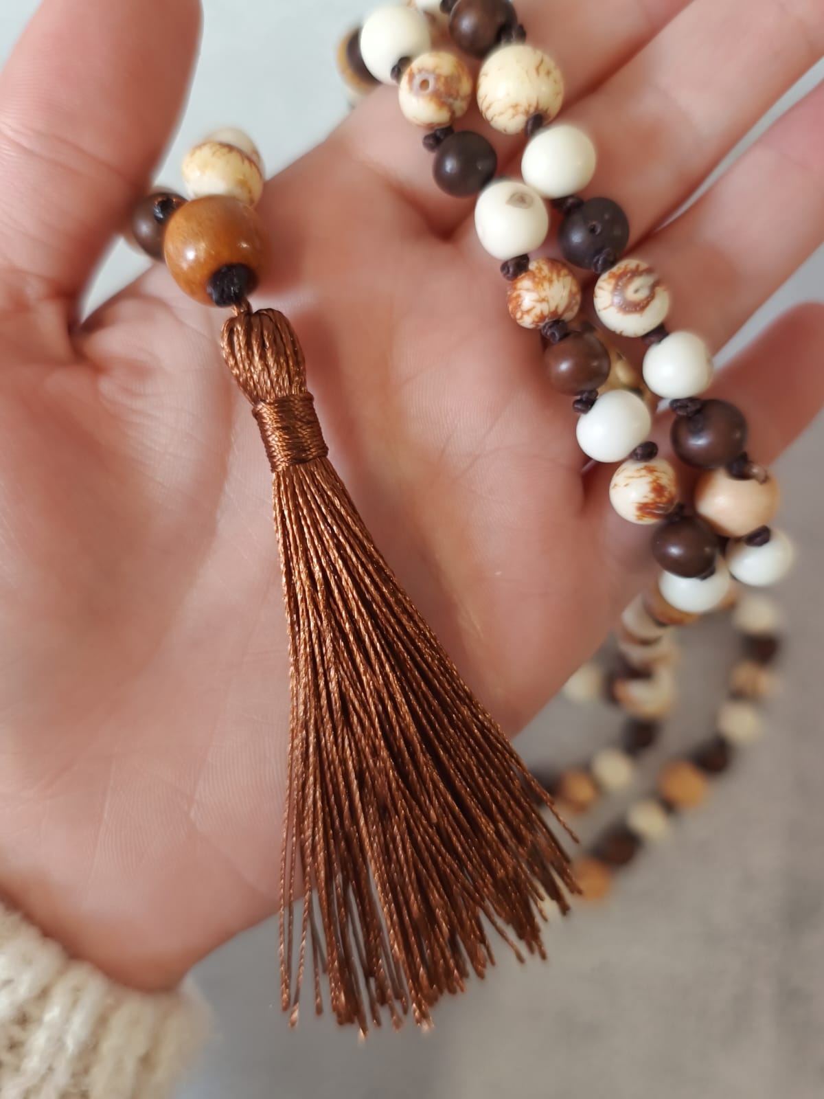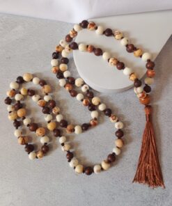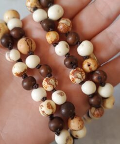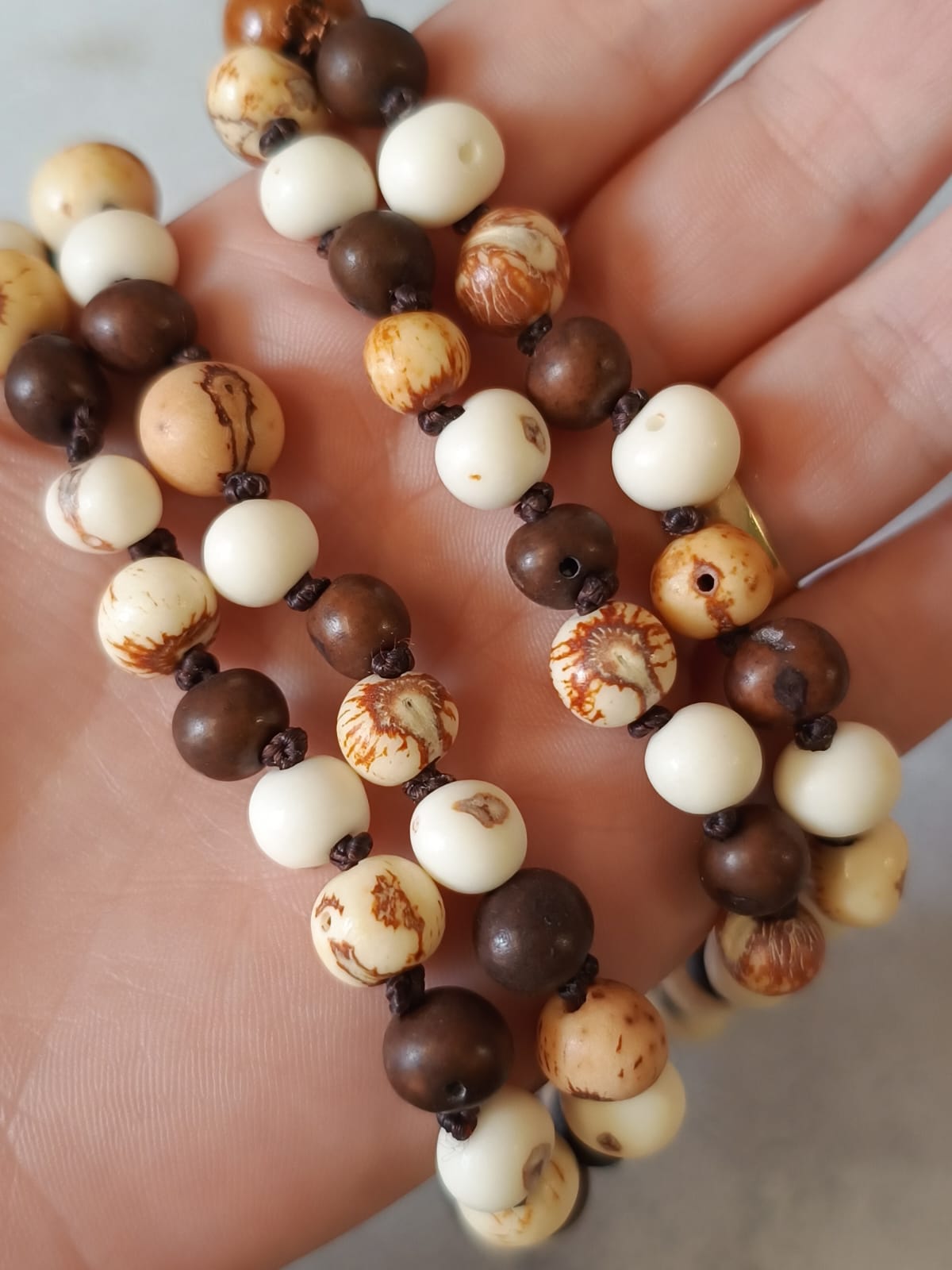 O Japamala de 108 Contas é um cordão usado na prática espiritual do hinduísmo e budismo. Cada conta representa uma repetição de um mantra durante a meditação, enquanto os praticantes deslizam uma conta entre os dedos. Com um nó guru marcando o início e o fim, e um nó entre cada conta, facilita a contagem e promove uma meditação concentrada. Feitos à mão por nós, com sementes de açaí.