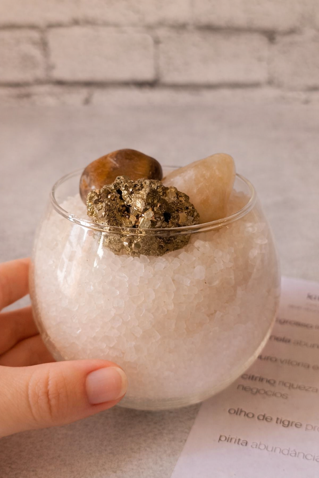 Um vaso redondo de vidro de 10 cm de diâmetro e 8 cm de altura, sal grosso, um informativo sobre o kit, uma ametista queimada de 3 a 4 cm, um olho de tigre de 3 a 4 cm e uma pirita de 3 a 4 cm.