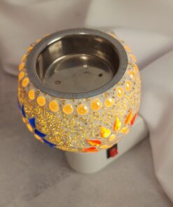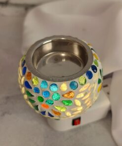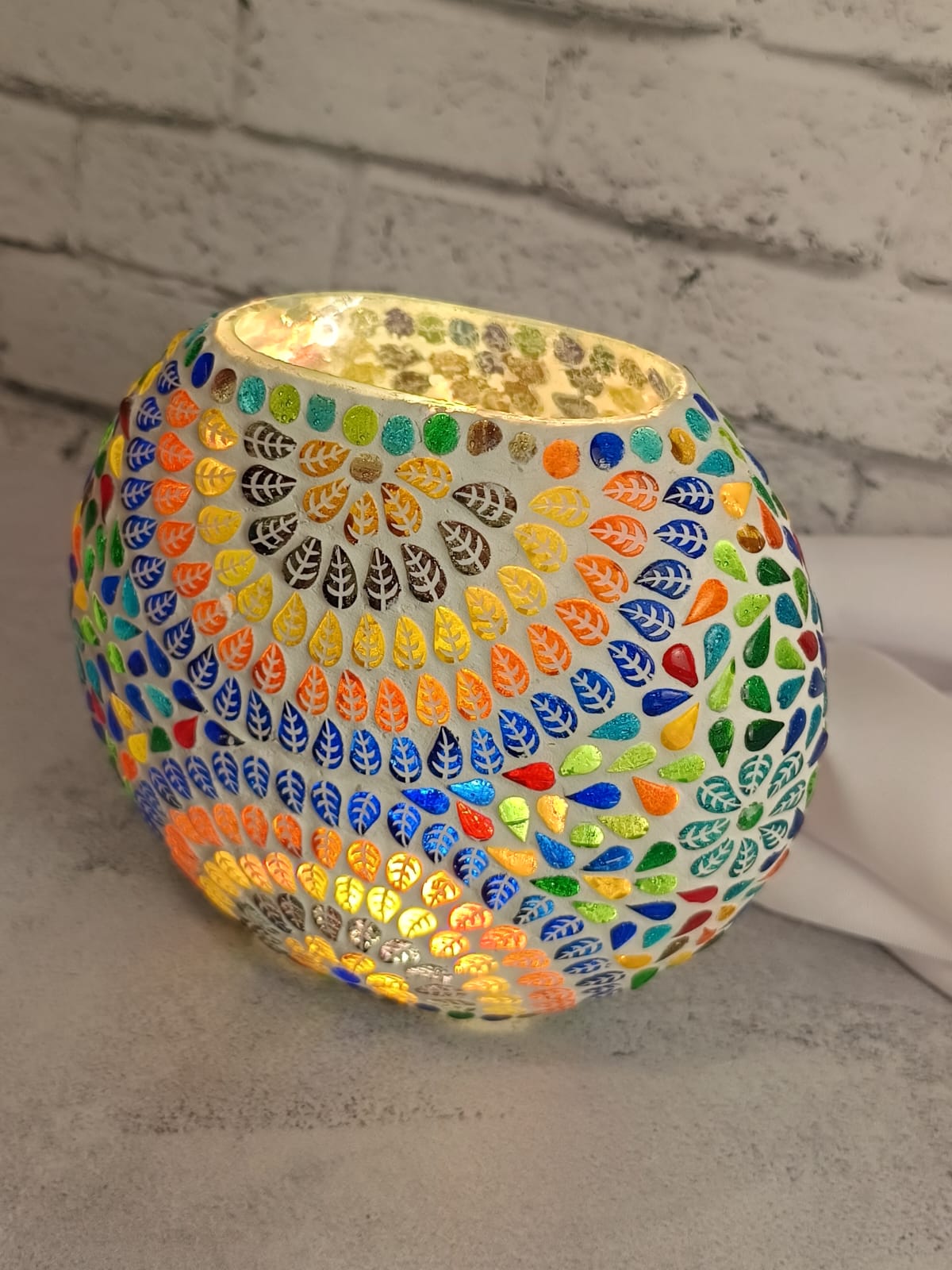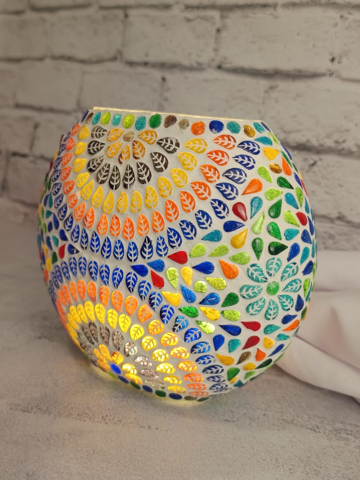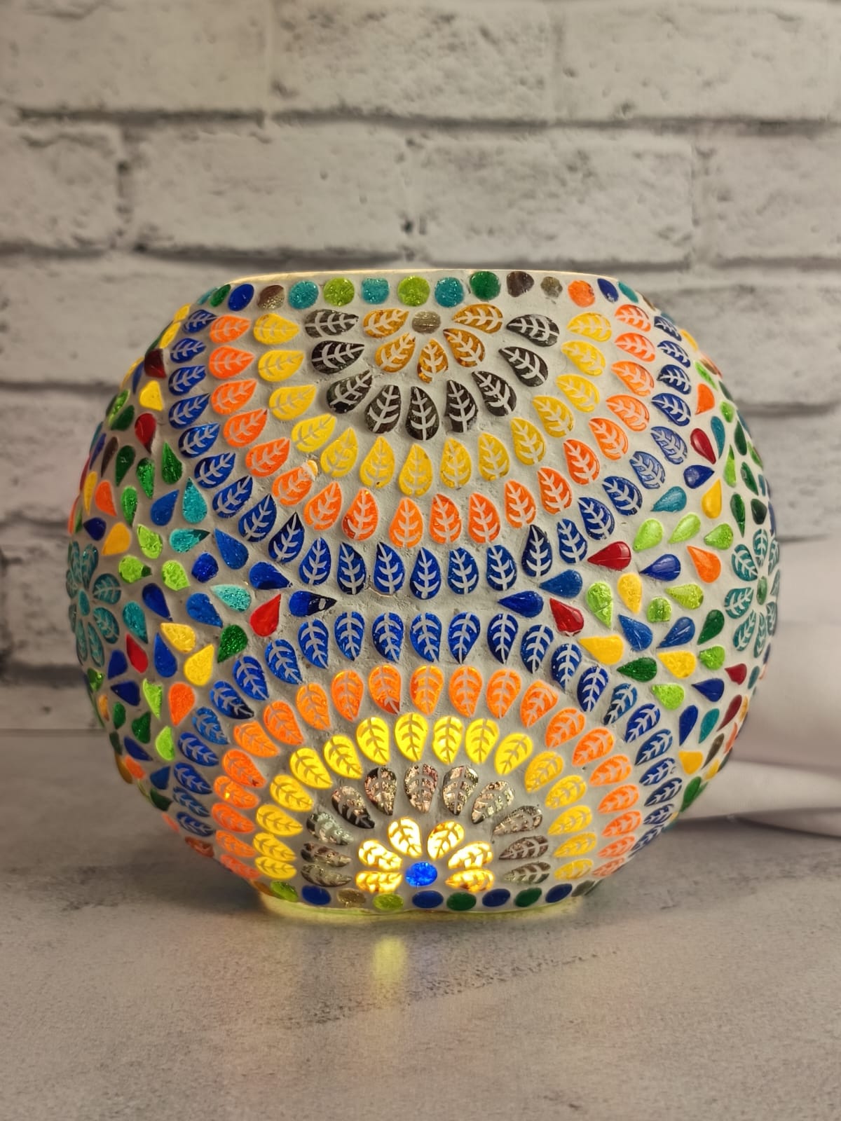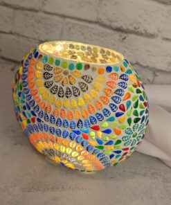 Uma luminária feita artesanalmente na Índia, utilizando a técnica de mosaico, que ilumina o ambiente com cor.