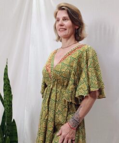 Vestido indiano em poliéster Premium com toque de seda e detalhes em dourado.