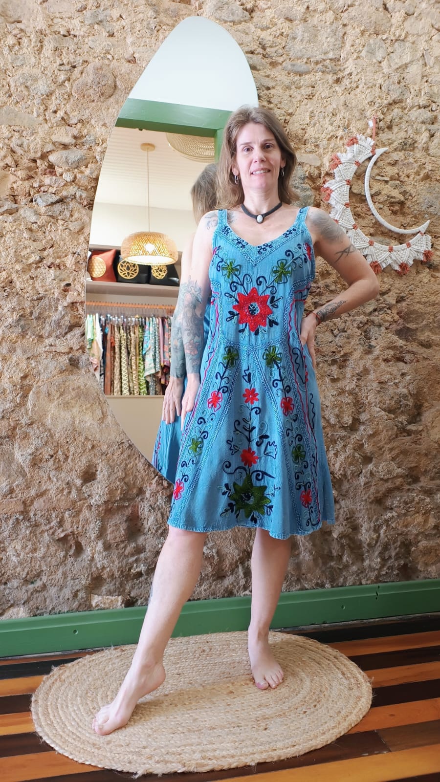 Vestido indiano estonado, bordado em fio de seda com elástico nas costas e cordão para ajuste.