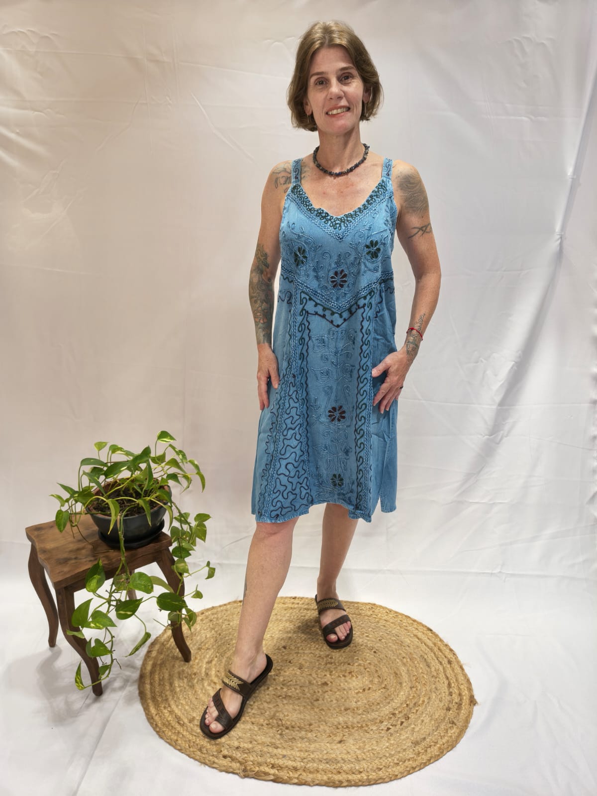 Vestido indiano estonado, bordado em fio de seda com elástico nas costas e cordão para ajuste.