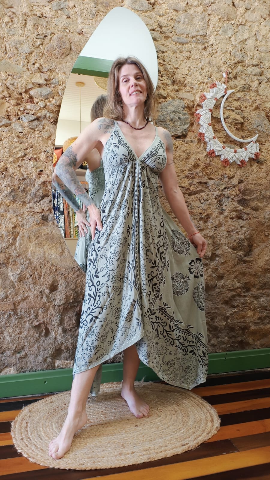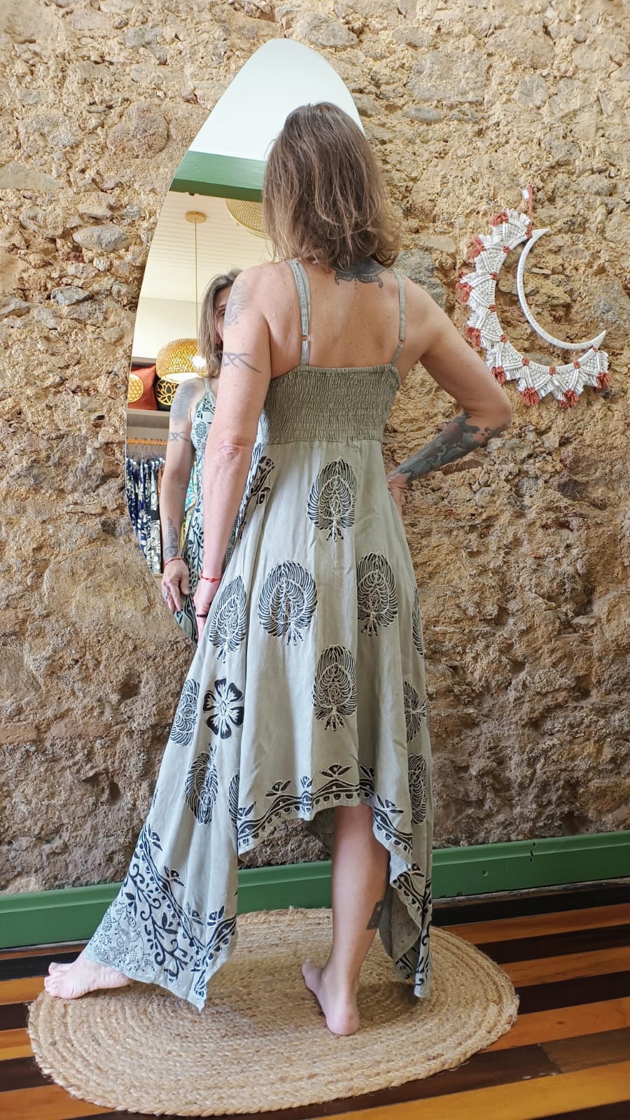 Vestido assimétrico indiano, bordado em fio de seda, alças reguláveis e com elástico nas costas.