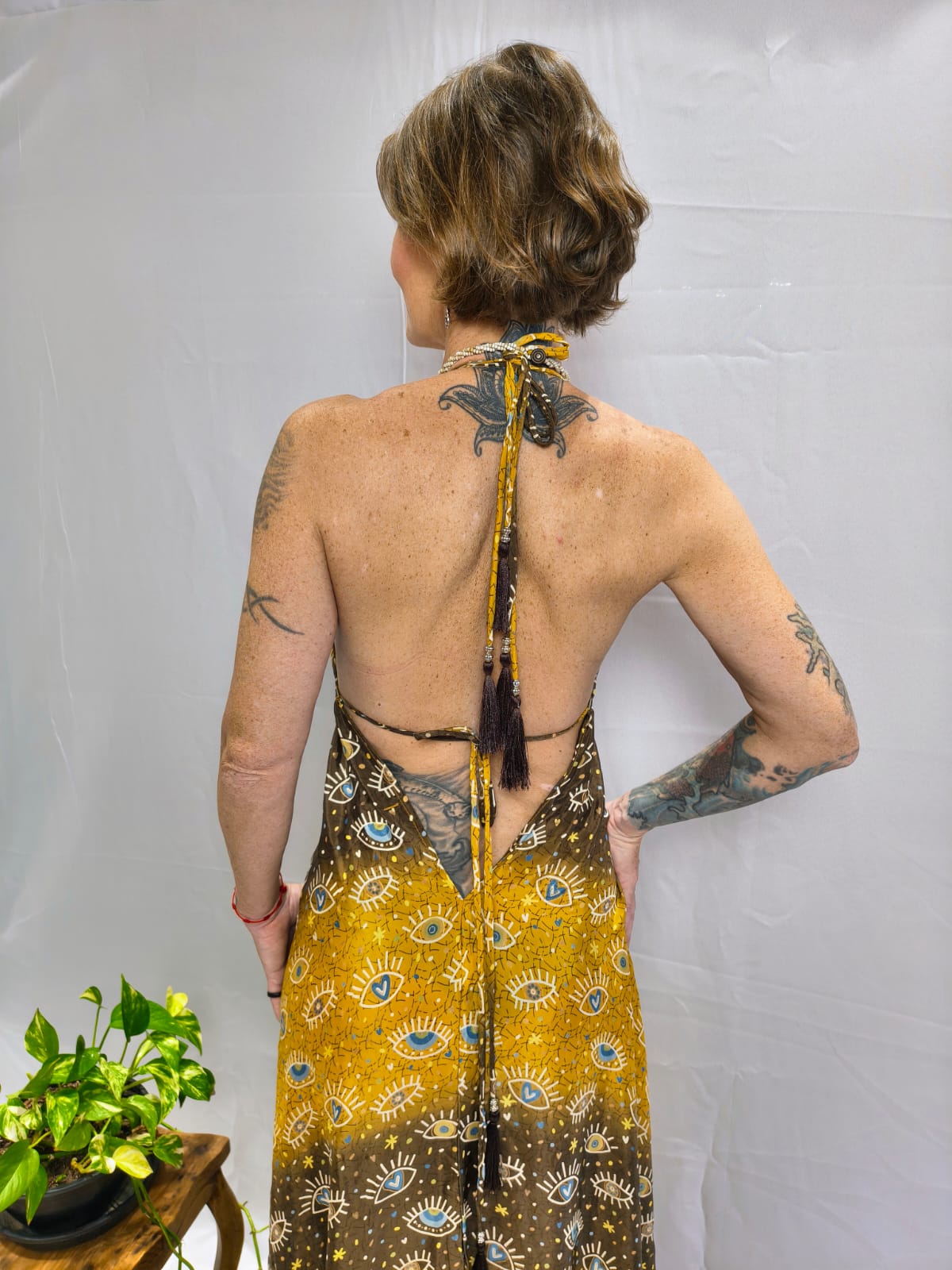 A modelo mede 1,60 e veste número 38. Medida do busto: 85 cm
