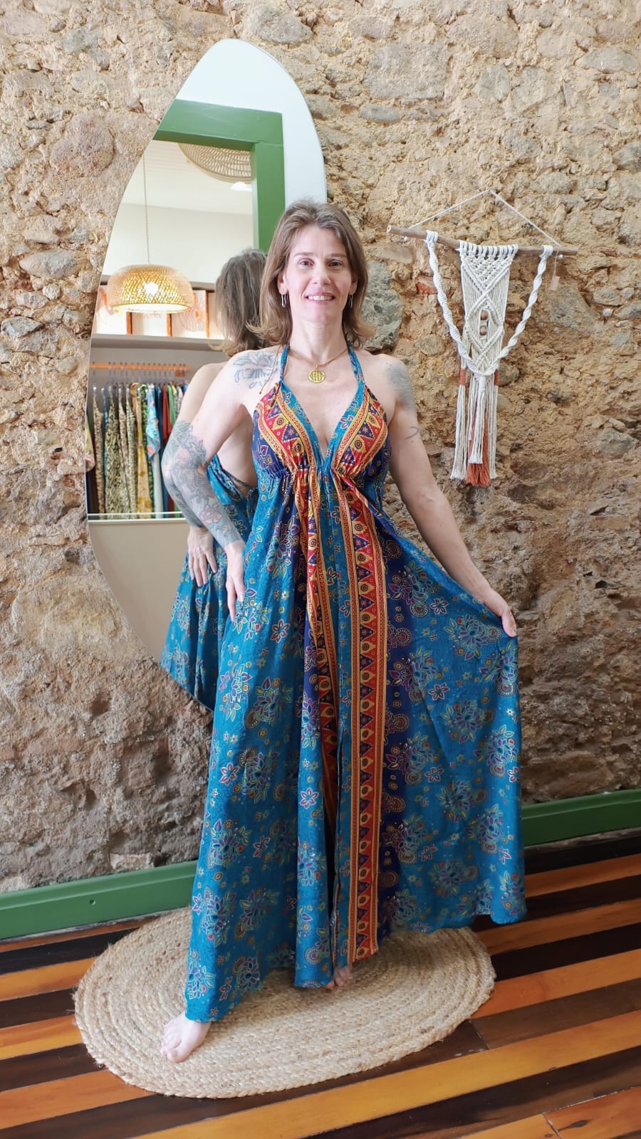A modelo mede 1,60 e veste número 38. Medida do busto: 85 cm