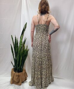 O vestido é confeccionado em algodão e traz estampa feita com a técnica tradicional de block print, onde cada desenho é aplicado manualmente com carimbos de madeira talhados à mão. Esse processo artesanal confere pequenas variações na estampa, tornando cada peça única.